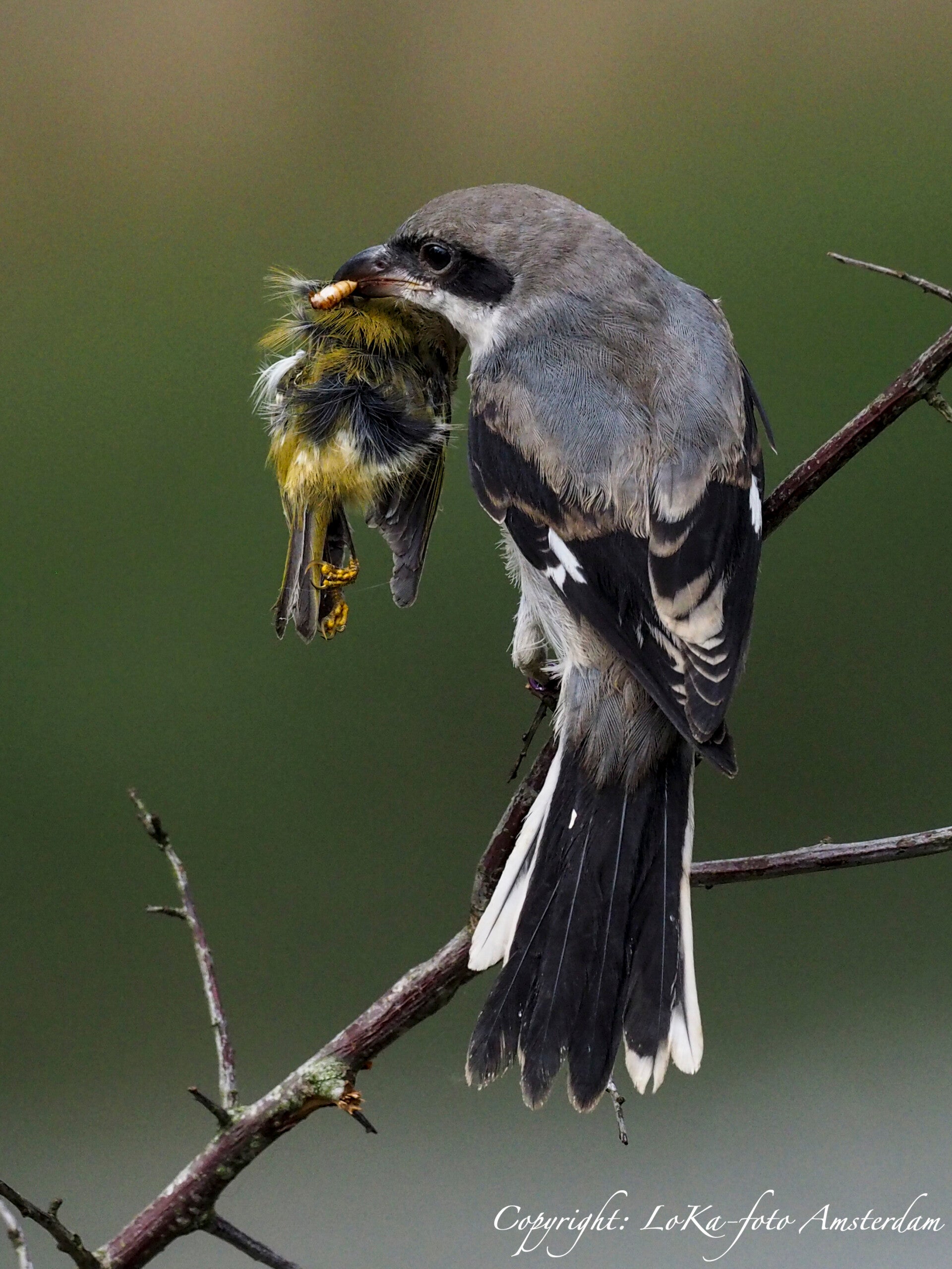De buit wordt vastgeklemd tussen takken of opgeprikt op de doornstruiken.