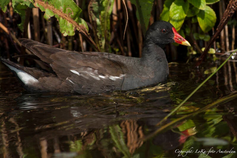 De Waterhoen is donker van kleur, wordt soms verward met de Meerkoet die zwart is met een witte kop. Ze hebben een rode snavel en de punt is geel van kleur. In tegenstelling tot de Meerkoet hebben ze geen zwemvliespoten maar lange groene tenen waarmee ze regelmatig foerageren op de oever.